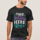My 11 yo wore adult XL (5’7” 165#). The 8yo is small framed. She wore adult small and tied it in the back. Grandma wore adult large with long sleeve shirt underneath. Tall girl adult medium. Dark haired male adult large. Good quality dark Heather gray, Gildan brand shirt. -it was next up from basic choice and cost about $20 per shirt. Not too thick or thin. Washed and dried well, no major shrinkage. Not see-through. Can wear a bra under it fine. Screen print is just as shown and well done, front and back.
