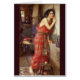 Thisbe by John William Waterhouse, oil on canvas, 1909, is a vintage painting of a young woman in an interior leaning with her ear to a crack in the wall. The figure wears a long, bright red patterned dress as she listens intently. The subject is taken from stories from ancient Greek and Babylonian mythology of young star-crossed lovers whose families forbid them to wed and could only speak in whispers through the walls of their houses. The Pre-Raphaelite artist Waterhouse paints a timeless and memorable image of an archetype of the forlorn young lady who yearns to be with her betrothed.