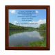 This box features a photograph of Canoe Creek Lake near Hollidaysburg PA. It is one of Pennsylvania's State Parks. The lighting was just right to catch the reflections cast on the lake's surface. The photo lended itself to an inspirational quote from Walden by Henry David Thoreau. The quote is "A lake is a landscape's most beautiful and expressive feature. It is Earth's eye; looking into which the beholder measures the depth of his own nature." This charming photographic landscape definitely has a nice contrast and balance between the trees angling downward from the left side and the clouds doing the same from the right. It gives the photo a pleasant symmetry. The photographer credit is nicely blended into the grass in the bottom right corner.