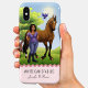 Showcase your love of horses with this customizable iPhone case that features a beautiful illustration of a Thoroughbred horse and rider standing in a lush green pasture, accompanied by a whimsical bluebird. A trendy scalloped edge border in soft shades of pink adds a touch of femininity to this phone case. Personalize this design by adding a name, special message, or name of your recipient’s favorite horseback riding facility. Tailored for equine enthusiasts of all ages, this customizable phone case will make a one-of-a-kind gift.