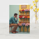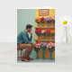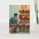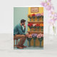 Designed with a quiet, tender mood, this card shows a man perched on a simple wooden stool as he leans forward, chin resting in his hand, choosing flowers with the kind of careful attention you’d give to someone you adore ❤️. He wears a muted teal pullover and warm tan trousers, and his focused gaze lingers on a tiered shelf packed with round, pom‑pom-like blooms in oranges, deep reds, lavenders, and soft pinks. The bouquets sit in clear glass vases tied with rustic twine, adding a gentle, affectionate touch to the tidy arrangement. Warm wooden shelving stretches across the scene, set against a golden-yellow wall that feels sunny and welcoming, with a cool mint-green panel along the left edge for contrast 🌼. Near the top, a framed note hangs above the highest shelf, with small dark lettering centered on a light background to mark the occasion. The overall layout feels calm and intimate, like a moment of choosing something special for a close friend or loved one. The framed message sits above the upper shelf while the colorful flower spheres line up neatly in glass vases across the wooden tiers.