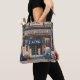 THREE BICYCLES PARKED IN FRONT OF BUILDING TOTE BAG
