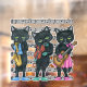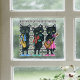 This window cling has three black cats playing musical instruments including a saxophone, violin, and guitar all wearing gloves and shoes in various colours standing on a sheet of music with music notes.