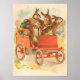 Easter Bunnies delivering eggs in a red car. Vintage Victorian greeting card.