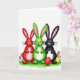 This card features three long-eared rabbits standing close together on a small patch of green grass, their shoulders nearly touching in a friendly, affectionate way 🐰. One rabbit is colored deep red, the next is spring green, and the third is dark charcoal, all set against a plain white background that keeps the focus on their faces. Each has tall ears with pink inner details, a small rosy nose, thin dark whiskers, and a wide toothy smile that feels shared, like they’re in on the same sweet joke. The coloring has soft shading that makes their rounded bodies look gently plush, with subtle gradients rather than sharp edges. A simple Easter greeting sits near the top in a light, easy-to-read style, using a soft pastel tone that doesn’t compete with the illustration 🌷. Small purple and yellow flowers dot the grass below their feet, adding a springtime touch without crowding the scene. Near the darker rabbit, two smooth oval eggs—one red and one yellow—rest in the grass.