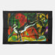 Beautiful and brightly colored oil on canvas painting by German artist Franz Marc entitled, "Three Cats". The cat in the foreground is black and white, standing on its front paws with back legs in the air, while one yellow cat and a large red cat are in the background. Wonderful combination of reds, greens, yellows and purple. Completion date: 1913.