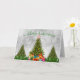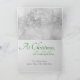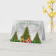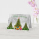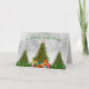 Three decorated Christmas tree's with present's with a snowy background holiday card that can be personalized.