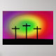 Three crosses silhouetted in black against a glowing colourful background. Ideal as general Christian theme or for Easter especially.