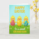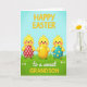 This card shows three round, golden-yellow birds with shiny black eyes, tiny pink beaks, and rosy cheeks standing close together on a rich green grassy hill, their poses suggesting an easy friendship like they’ve just met up for a spring stroll 🌷. Soft light falls across the scene, and the background fades from sky blue at the top into a pale, airy tint near the horizon. Each bird holds an egg-like treasure as if sharing small gifts: one has a red one with neat white polka dots, another has a smooth gold one, and the third carries a teal one sprinkled with yellow spots 🐰. Little white flowers dot the grass around their feet, adding gentle detail without crowding the picture. Across the top, a festive greeting appears in large gold letters, centered above the trio. Near the bottom, a smaller line of text in white cursive sits over the grass, followed by thicker gold lettering beneath it. The overall layout keeps the birds in the middle, the greeting above, and the message below, with the teal speckled egg angled slightly to the right.