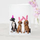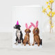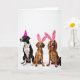 Designed with three pet dogs lined up side by side on a bright white studio background, the scene leaves plenty of open space above their heads to draw your eye to their faces. Soft, even lighting brings out fur details, from the left dog’s black-and-white coat to the two dogs beside it in warm brown and reddish-gold shades. A hot pink cone-shaped party hat sits on the left dog’s head as it turns slightly away, giving a quiet, tender look like it’s listening to a close friend. The two dogs on the right wear fuzzy pink headbands with tall bunny ears 🐰, leaning forward with open mouths and little pink tongues that make them seem like they’re sharing a joke together. There is no text on the design, so the white space stays uncluttered and keeps attention on the animals and their accessories. The contrast between the smooth hat and the plush ear headbands adds extra texture without crowding the simple setup 🌷. The bright fuchsia accessories stand out sharply against the white backdrop, with the bunny ears pointing straight up and the party hat angled neatly above the left dog’s forehead.