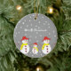Three cute snowmen custom Christmas ornament featuring three adorable snowmen with red hat, yellow scarf, button eyes and sticks on a grey background with snowflakes.