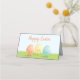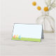 Place card with three, smiling, Easter egg characters. The characters and green grass are on both the front and back of the place card. The back of this place card has larger versions of the illustration and words. The words “Happy Easter” are customizable.