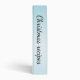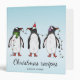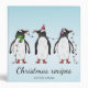 Destei's original illustration of three festive Gentoo penguins holding colorful Christmas lights with their beaks. One penguin is wearing a green scarf, another one is wearing purple ear protection and the third penguin in the middle is wearing a red and white Santa hat. The background is a light blue gradient. There are also personalizable text areas on the front and on the spine.