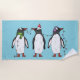 Destei's original illustration of three festive Gentoo penguins holding colorful Christmas lights with their beaks. One penguin is wearing a green scarf, another one is wearing purple ear protection and the third penguin in the middle is wearing a red and white Santa hat. The background color is light blue.
