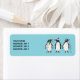 Destei's original illustration of three festive Gentoo penguins holding colorful Christmas lights with their beaks. One penguin is wearing a green scarf, another one is wearing purple ear protection and the third penguin in the middle is wearing a red and white Santa hat. The background color is blue and there is also a personalizable text area.