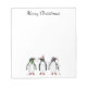 Destei's original illustration of three festive Gentoo penguins holding colorful Christmas lights with their beaks. One penguin is wearing a green scarf, another one is wearing purple ear protection and the third penguin in the middle is wearing a red and white Santa hat. There is also a personalizable text area that now reads: "Merry Christmas".