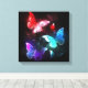 Three luminous, red, purple, green, textured, night butterflies on black luminous background.