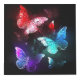 Three luminous, red, purple, green, textured, night butterflies on black luminous background.