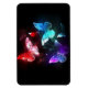 Three luminous, red, purple, green, textured, night butterflies on black luminous background.