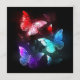 Three luminous, red, purple, green, textured, night butterflies on black luminous background.