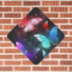 Three luminous, red, purple, green, textured, night butterflies on black luminous background.