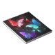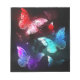 Three luminous, red, purple, green, textured, night butterflies on black luminous background.
