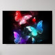Three luminous, red, purple, green, textured, night butterflies on black luminous background.