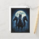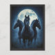 Three majestic black horses standing proudly under the glow of a full moon. The scene is bathed in a mysterious, blue-tinged light, and the low grasses in the foreground add to the wildness and natural feel. The horses have white markings on their foreheads, which contrast sharply with their dark coats.
