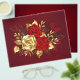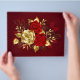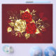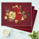 The composition of two artistically painted red roses and one golden rose, decorated with gold, jewel leaves on textured background.