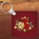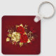 The composition of two artistically painted red roses and one golden rose, decorated with gold, jewel leaves on textured background.