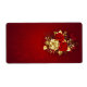 The composition of two artistically painted red roses and one golden rose, decorated with gold, jewel leaves on textured background.