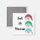 Three snowman faces each with a big grin and a carrott nose. One with a red toque, one in green and one in blue. Says Let it Snow!