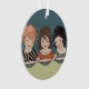 This round hanging ceramic ornament has three little girl sisters, one brunette, red hair, and blond sitting at a table together eating soup on a dark blue background. Customize your text on the back with the template.