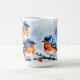 Three cute little birds perch on a snowy branch, surrounded by bright, red berries, as snow falls gently around them. Very charming and beautiful holiday mug.