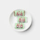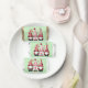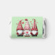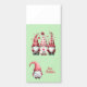 Three adorable little white bearded gnomes wear red and white pattern hats with hearts floating around them. The middle gnome holds a sign that says "I (heart) you". On the back is another gnome image and your custom signature in pink. Everything is placed on a pale green background. It's easy to customize to make appropriate for school classmates, or to give out to the neighborhood kids.