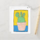 This art card has a naive art composition, hand drawn using pens and watercolour, of a cactus with three lobes on top in a flower pot. The background is yellow and blue, the pot is pinky beige and the cactus is very green with red spikes, with a thin black border and white surround. It is original and only available from The Art of Being Beth at Zazzle.