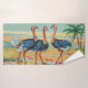 A very old, vintage label from India of three ostriches repurposed on a bath towel. There is a matching bath mat too!