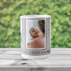 Personalize a unique keepsake for a new mom celebrating her first Mother's day with this three photo collage coffee mug. Mug design features three photo placements surrounded by an elegant frame with modern text with first Mother's day greeting and year separated by a single red heart. Background is a simple rustic gray wooden pattern.