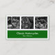 A business card template with three photo windows on the front and one on the back. This version has square black and white photos showing details of classic motorcycles. Company details on the front with name and contact details on the reverse on a variation of the front design.