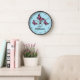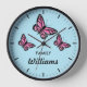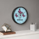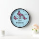This clock features three beautiful illustrations of pink butterflies on a blue background color. The clock face is made of simple and stylish black lines.