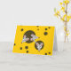 Cute children's illustration of three playful mice peeking out of cheese holes. One mouse peeking from one hole is playfully pulling the other mouse peeking out of another hole by its ear. The whole product is covered by yellow cheese with holes image, so it looks like one big piece of cheese.