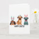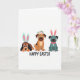 This card features three stylized puppy-like characters arranged in a neat row on a bright white background, creating a friendly little scene that feels like a shared holiday moment 🐰. On the left, a brown-and-black pup lounges with long ears and wears upright rabbit ears in soft blue and pink, looking sideways with wide dark eyes as if watching its friends. In the center, a tan-and-brown pup sits facing forward with a small crown of pink flowers and green leaves, its slightly open mouth giving it a gentle, welcoming look. On the right, a teal-grey-and-black pup sits tall in matching pink bunny ears and a pink bow tie, angled just enough to seem like it’s posing for the others 🐇. The three poses create a quiet sense of closeness, like companions gathered for a photo where their expressions meet in a tender, easy way. Below the characters, the words “Happy Easter” are centered in dark, thick, simple lettering that stands out clearly against the white space. Soft pastel accents—pink blossoms, light blue ear details, and the rosy bow tie—add small pops of color around the trio. The flower crown shows pale pink petals with tiny green leaves, and the bunny ears have rounded tips with pastel inner panels 🌷.