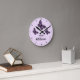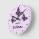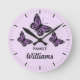 This clock features three beautiful illustrations of purple butterflies on a lilac background color. The clock face is made of simple and stylish black lines. There is also text that reads "Family" with a customizable text area for the name.