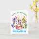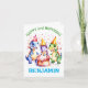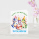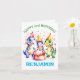 Three rex cute dinosaurs birthday party greeting card, cute three dinosaurs in party hats with a birthday cake confetti and balloons falling around for toddler small kids who like dinosaurs
