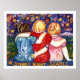A colorful drawing of three sisters sitting together under the starry sky in Seattle.