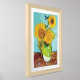 Three Sunflowers (1888) by Vincent van Gogh is a vibrant still life that showcases the artist’s signature thick brushstrokes and bold use of color. The painting features three sunflowers in a simple vase, their golden petals contrasting against the aqua blue background. Van Gogh's vivid yellow palette brings energy and life to the scene, capturing the fleeting beauty of the flowers. This piece is part of a series of sunflower paintings created by the artist, highlighting his fascination with the flower as a symbol of life, vitality, and transience.