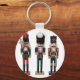 This double sided button keychain, zip pull, features three traditional Nutcrackers, one with a pair of cymbals, one with an axe and one with a sword against a white background. perfect as a gift or stocking filler.