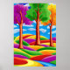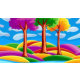 Three trees with different color leaves on a colorful field with a blue sky and white clouds, vibrant colors,