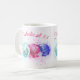This happy birthday mug design features three watercolor tropical cocktail drink umbrellas in teal, pink, and purple. Personalize the "Fantastic at 55" text for your occasion. The design is on both sides of the white ceramic mug.