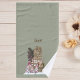 Three Vintage Gnomes Hand Towel. This adorable design has three cute gnomes resting after a long day picking up packages in their wagon. Design is vintage looking pinks, blues and golds. Easily edit the greeting with name.